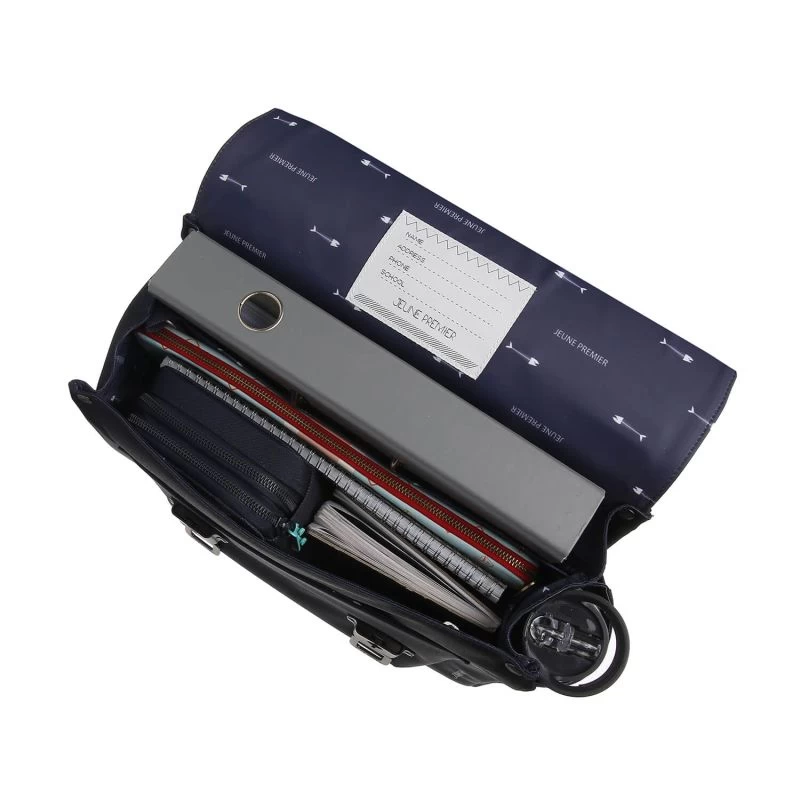 L’ensemble du cartable Jeune Premier se ferme via un grand rabat pourvu d’attaches métalliques qui se scellent via un système de verrouillage breveté. Il est très facile à utiliser.