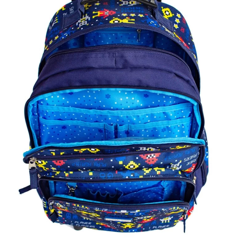 Le sac à dos 2 roues Snowball Kid robot bleu met à disposition un grand compartiment doublé avec fermeture à glissière. Il peut accueillir des grands formats de cahiers comme 24×32, des documents A4, classeurs en tout genre et agenda y trouvent une place aisément. Sur la partie frontale, deux poches à zip proposent différentes solutions de rangements pour ranger et sérier les fournitures scolaires. 3 autres poches zippées en complément sont présentes pour avoir des objets et accessoires facilement et rapidement accessibles.