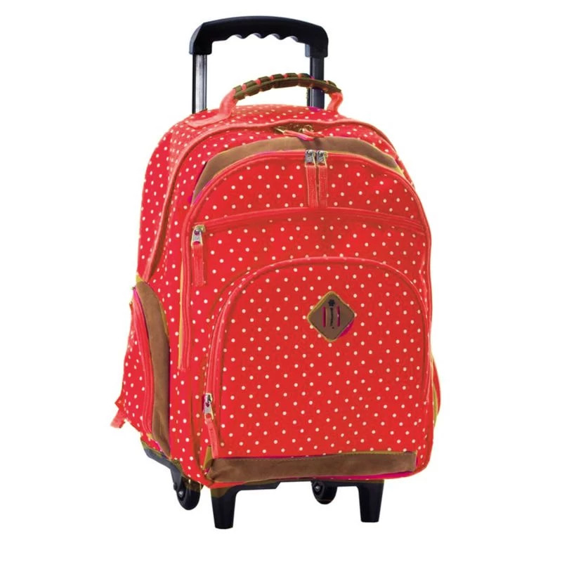 Le sac à dos à roulettes à Pois blancs et fond rouge de la marque Snowball permet d’emporter le nécessaire des fournitures scolaire avec confort et organisation. Une utilisation adaptée à partir du CE2. Conçu pour faciliter les trajets de votre enfant, trolley et roulettes permettent de le tracter avec fluidité. Son espace de rangement spacieux permet d’emporter toutes les affaires utiles au bon déroulement de la journée ou un peu de linge s’il vient à servir comme sac d’appoint le temps d’un week-end. Pour ne rien gâcher, il est proposé à un rapport qualité/prix très attractif.