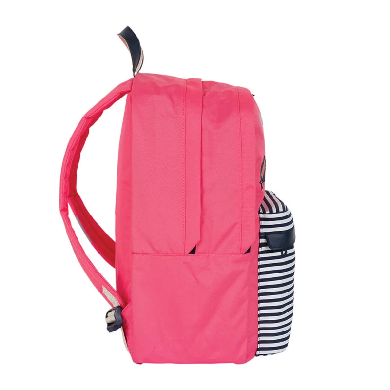 Le modèle Enora est de couleur rose avec des patchs brodés en lurex doré. Des rayures bleues et blanches se trouvent sur la petite poche avant.
