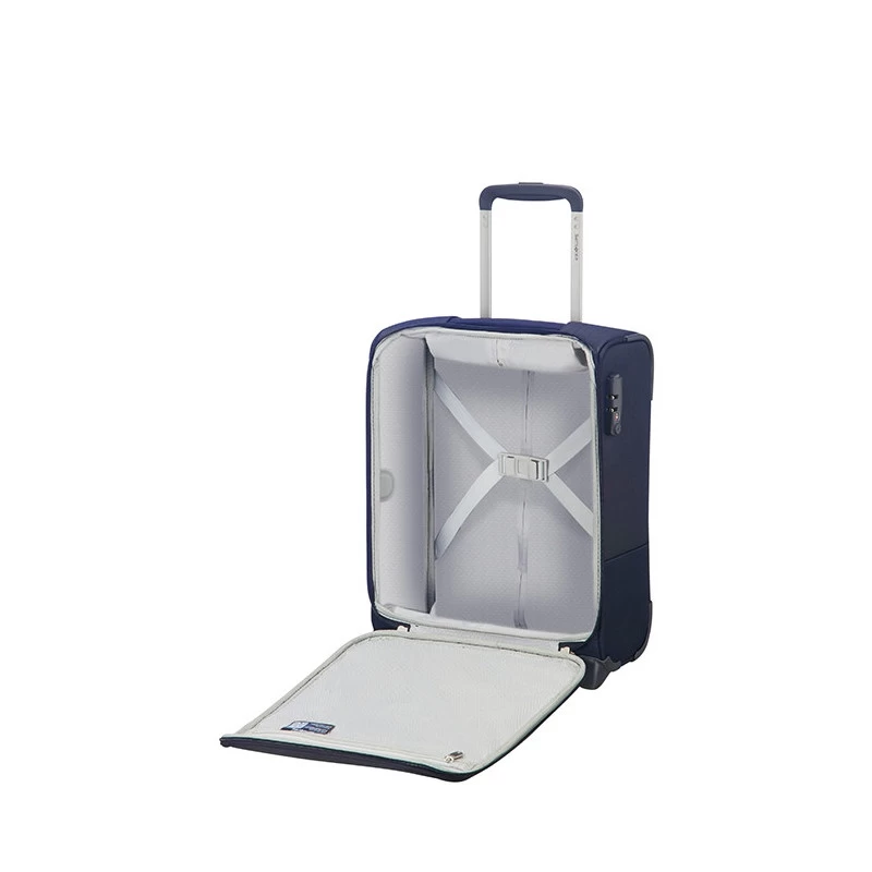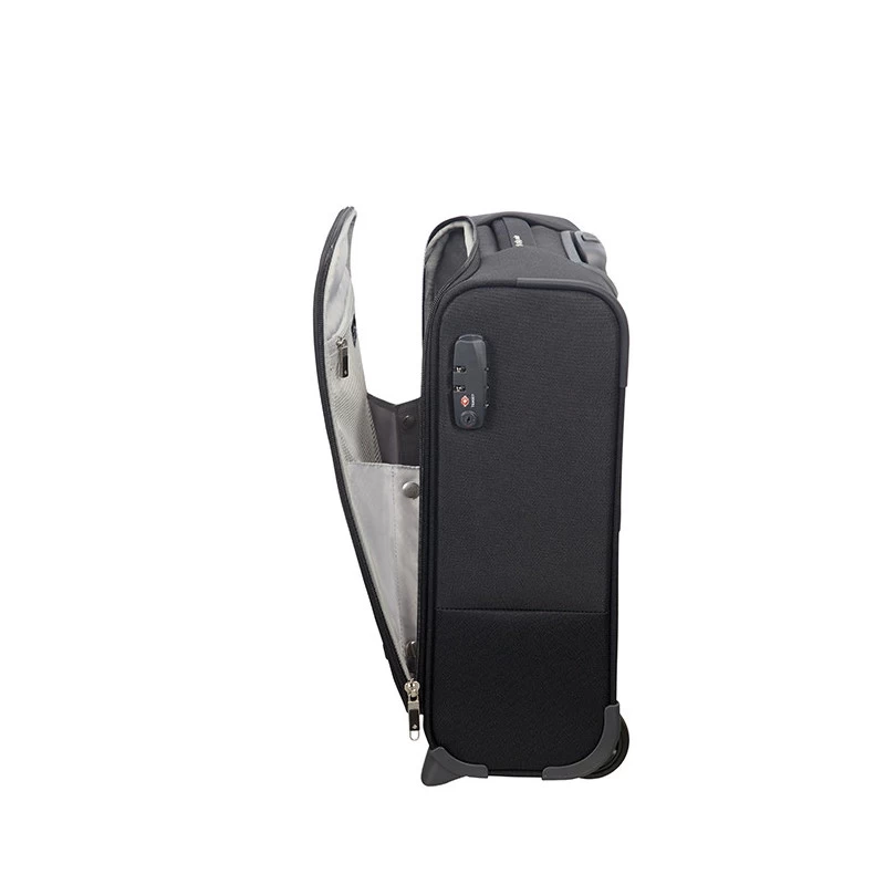 La valise cabine souple format compact 45 cm en 2 roues de la gamme Base Boost de la marque Samsonite est un bagage d’une remarquable légèreté grâce à sa composition en Polyester de qualité. Doté d’un design à la fois classique, moderne et élégant de par son aspect bicolore et ses finitions très soignées. Ce bagage répond parfaitement aux besoins pour un court séjour (type un week-end à quelques jours) et aux normes de la majorité des compagnies aériennes grâce à son petit format très compact (45 x 35 x 18 cm). En gage de qualité, cette valise dispose d’une garantie fabricant de 5 ans par la marque Samsonite.