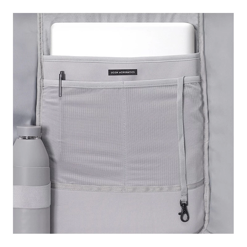 A l’intérieur, il comporte un grand compartiment accessible soit par le haut grâce à un système de rouleau fermé par une sangle velcro soit par une fermeture à glissière dissimulée sur l’un des côtés du sac. Ce compartiment se compose de nombreux espaces de rangement afin d’organiser au mieux vos effets personnels: un emplacement pouvant accueillir un ordinateur jusqu’à 15,4 pouces avec 2 poches en filet où vous pourrez glisser votre smartphone, porte-monnaie…; un porte bouteille élastique ou encore une attache pour porte-clés.